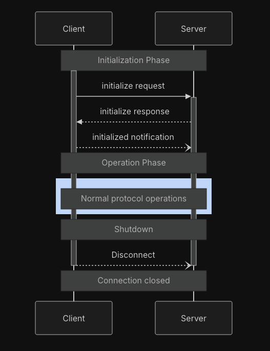 MCP 명세서을 보면 위에서 예시로 든 tools, sampling 외에도 다른 요소들(primitives)에 대한 요청, 응답 예시가 있다. MCP 참여자들의 시퀀스 다이어그램들도 있으니 한번 읽어보면 이 프로토콜에 대한 개념을 잡을 수 있다.