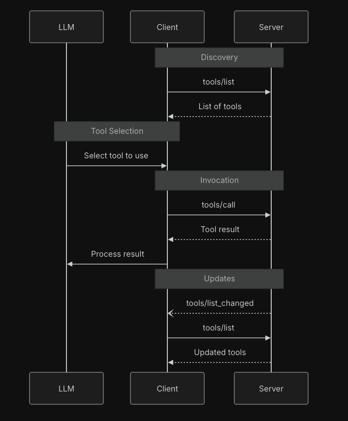 MCP 클라이언트는 요청을 보낼 때 method라는 프로퍼티에 어떤 연산을 수행할지 함께 전달한다. 각 기본 기능 유형에는 발견(*/list), 조회(*/get), 실행(tools/call) 등이 존재한다. 예를 들어, MCP 클라이언트가 MCP 서버가 제공하는 도구 리스트를 사용할 때 아래 흐름을 통해 진행된다.