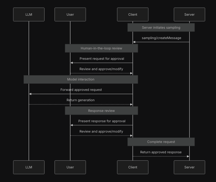 sampling/createMessage요청이 서버에서부터 시작한다.- 여러 단계의 사람 참여(human-in-the-loop) 같은 검증 지점을 통해 보안(security)을 보장한다.