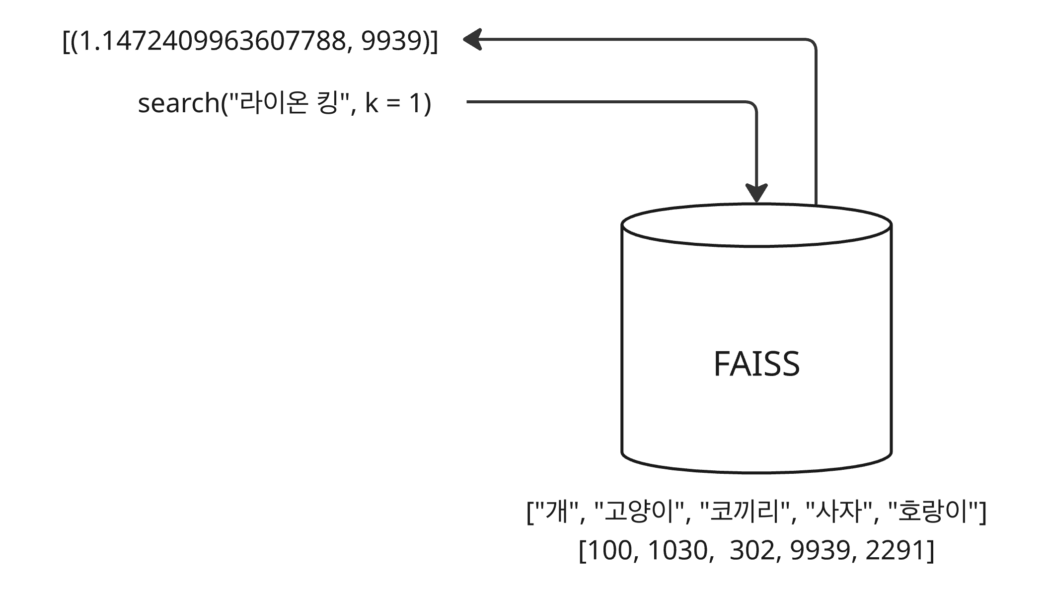 - FAISS 벡터 데이터베이스에 [“개”, “고양이”, “코끼리”, “사자”, “호랑이”]에 대한 벡터들이 저장되어 있다.