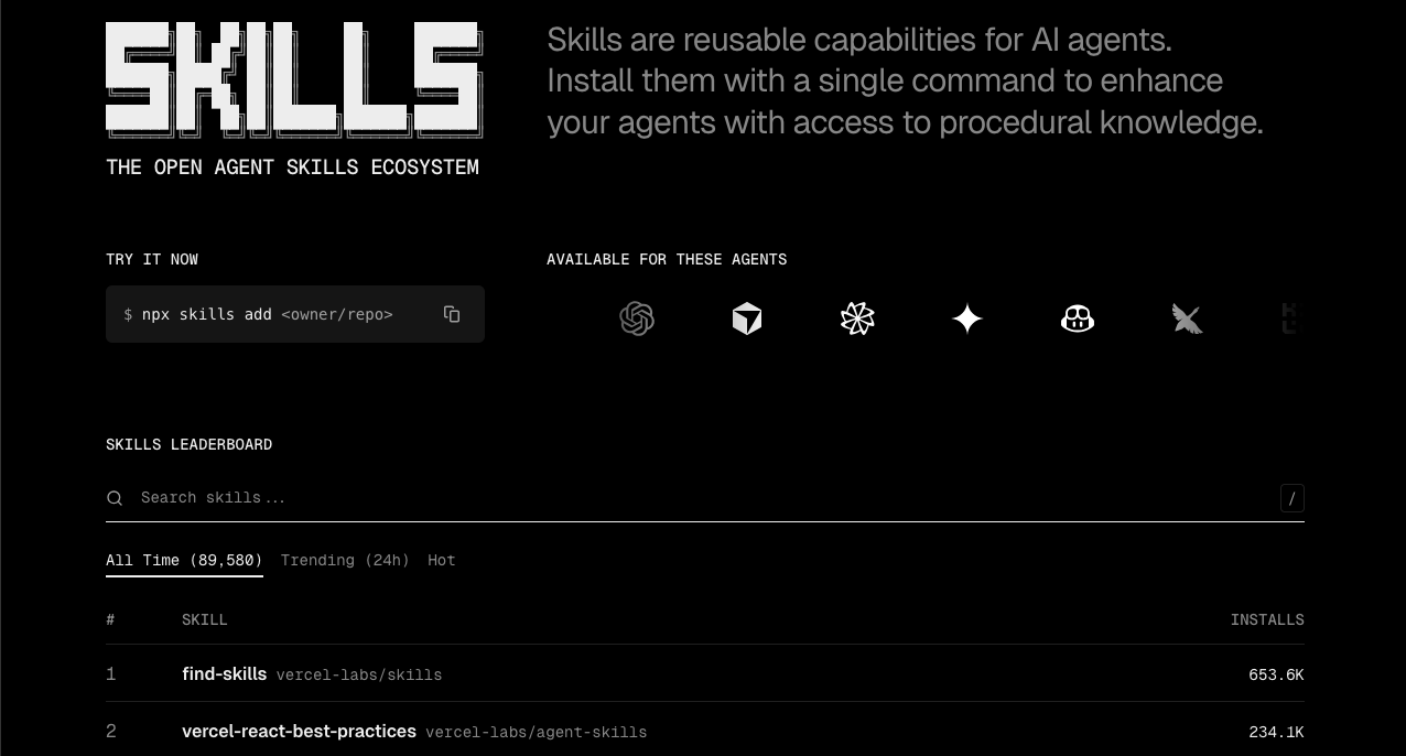 이미 많은 에이전트 스킬들이 존재한다. “거인의 어깨에 올라가라”라는 말이 있듯이 잘 만들어진 스킬들을 재사용하는 게 좋다. skills.sh 사이트에 접속하면 이미 만들어진 스킬들을 검색해서 사용할 수 있다.