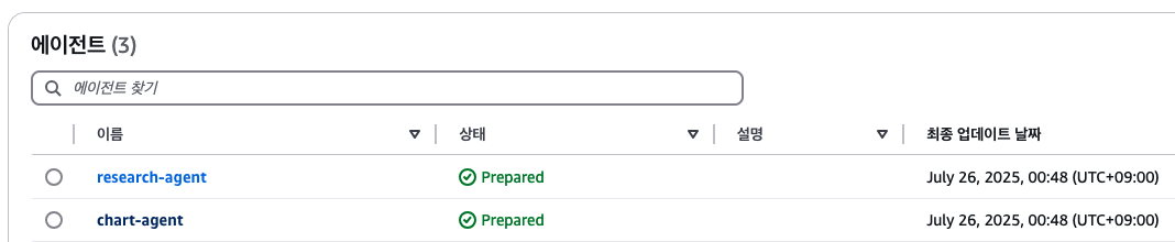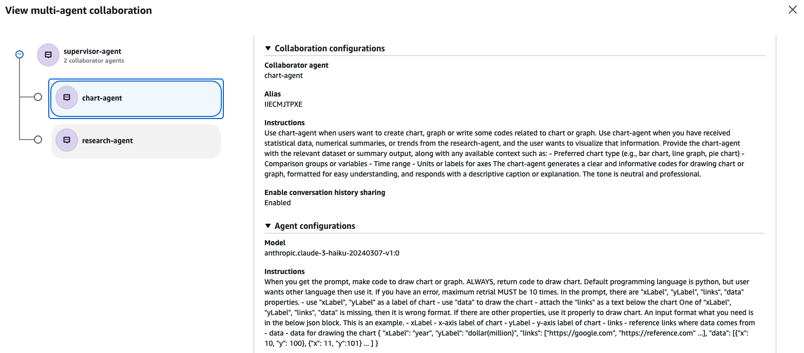 협력 에이전트들을 모두 추가한 후. AWS 웹 콘솔에서 관리자 에이전트의 Multi-agent collaboration 섹션을 확인해보자. 추가한 협력 에이전트들과 각자의 협력 지시문을 확인할 수 있다.