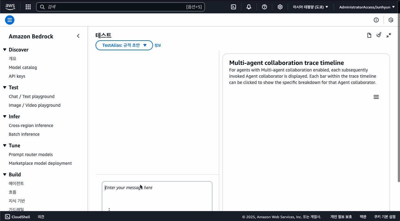 AWS 웹 콘솔에서 간단하게 프롬프트를 테스트할 수 있다. 2000년부터 현재까지 한국의 GDP 상승률을 조사하고, 관련된 코드를 생성해달라고 요청했다. 프롬프트 실행 경로를 실시간으로 추적하여 어떤 에이전트와 어떤 커뮤니케이션을 했는지 확인할 수 있다.