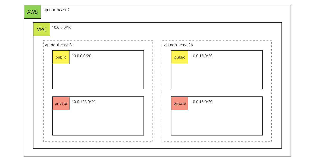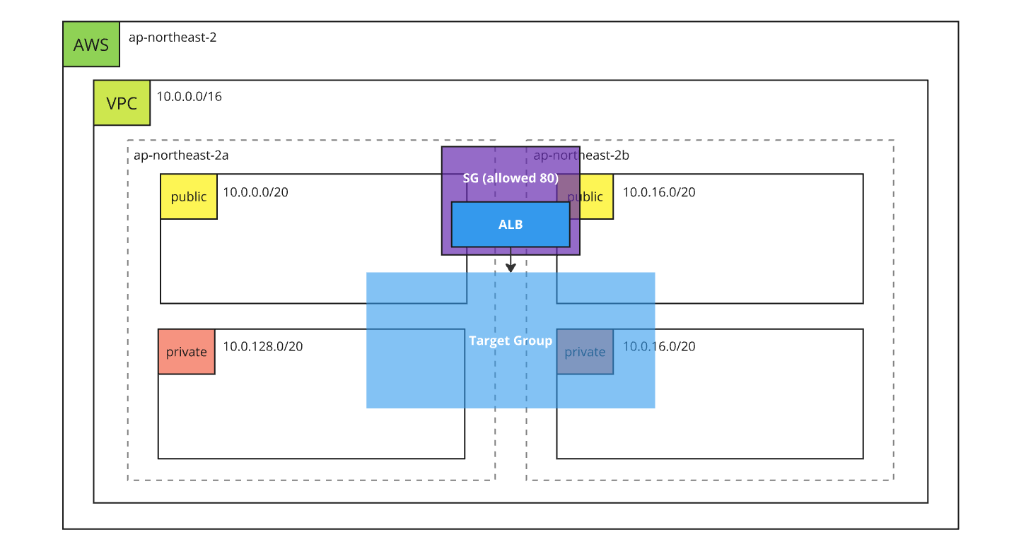 이 글은 ECS(Elastic Container Service) Fargate 클러스터를 위한 애플리케이션 로드 밸런서(ALB, Application Load Balancer)와 타겟 그룹(target group)을 만들고 둘을 연결하는 방법에 대해 다룬다. VPC(Virtual Private Cloud)는 이미 구축된 상태에서 진행한다. VPC 구성은 다음과 같다.