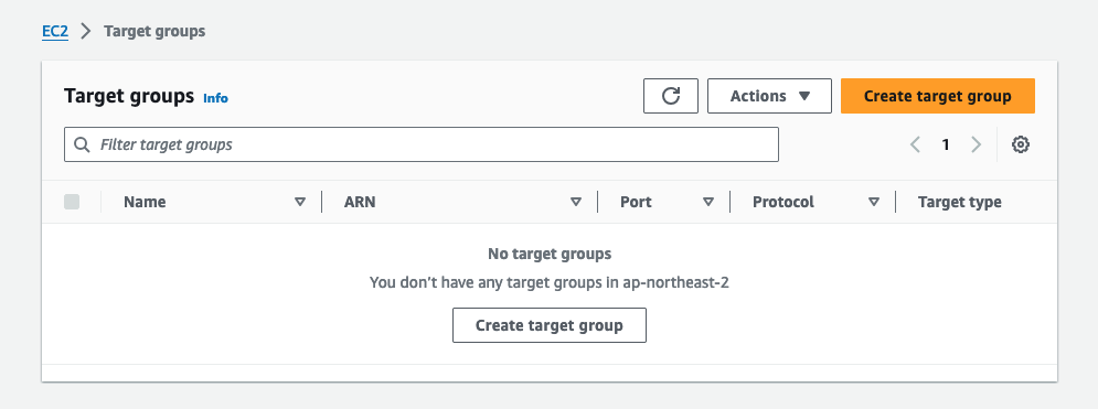 타겟 그룹 대시보드로 진입하면 타겟 그룹 리스트 화면이 보인다. 이 곳에서 새로운 타겟 그룹을 생성한다.