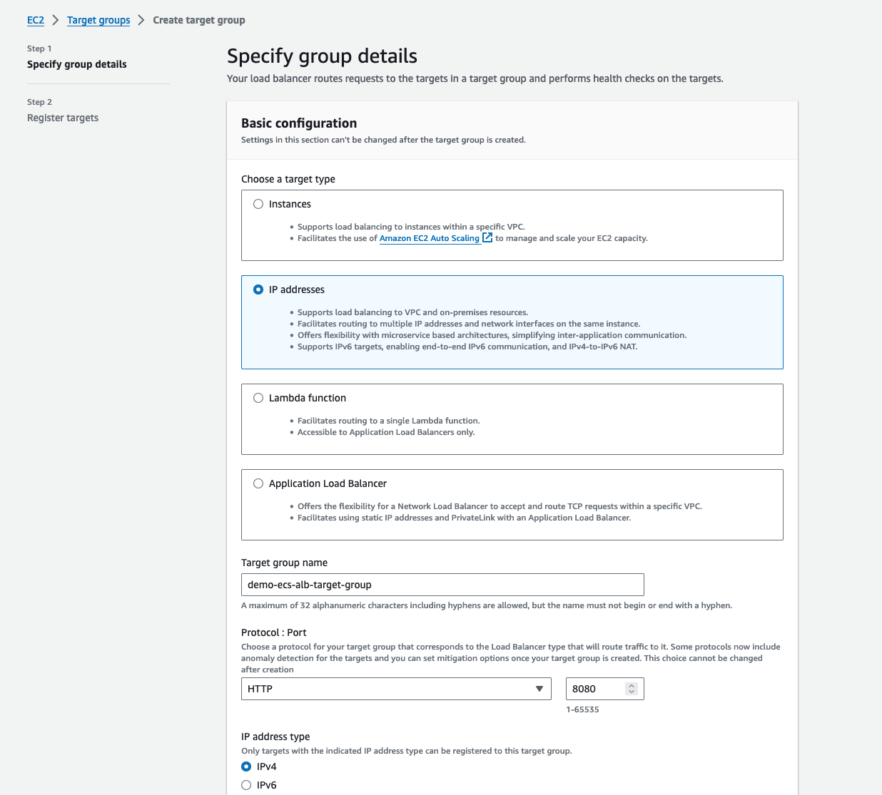 타겟 그룹 관련된 설정을 선택한다. 다시 한번 이야기하지만, 이 글은 ECS Fargate 클러스터 환경을 위해 타겟 그룹과 로드 밸런서를 구축하는 과정이다. EC2 인스턴스 같은 단순 컴퓨팅 리소스에 연결할 타겟 그룹이 아니기 때문에 주의하길 바란다.