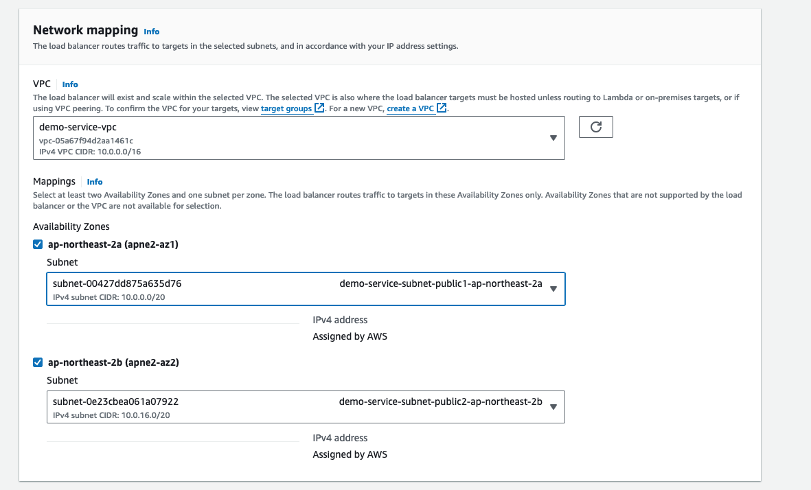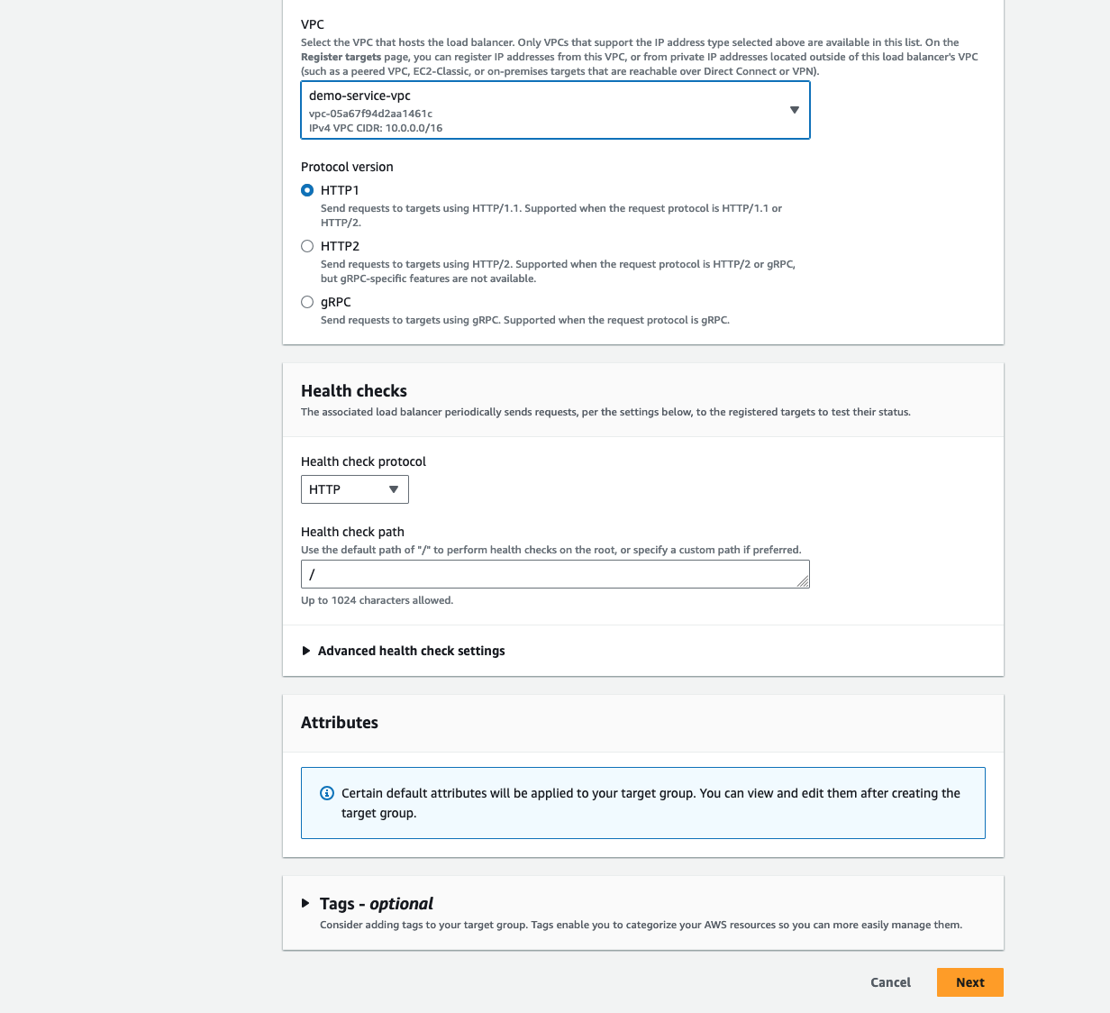 demo-service-vpc를 사용한다. - 프로토콜 버전은 기본으로 설정된 HTTP 1을 사용한다.