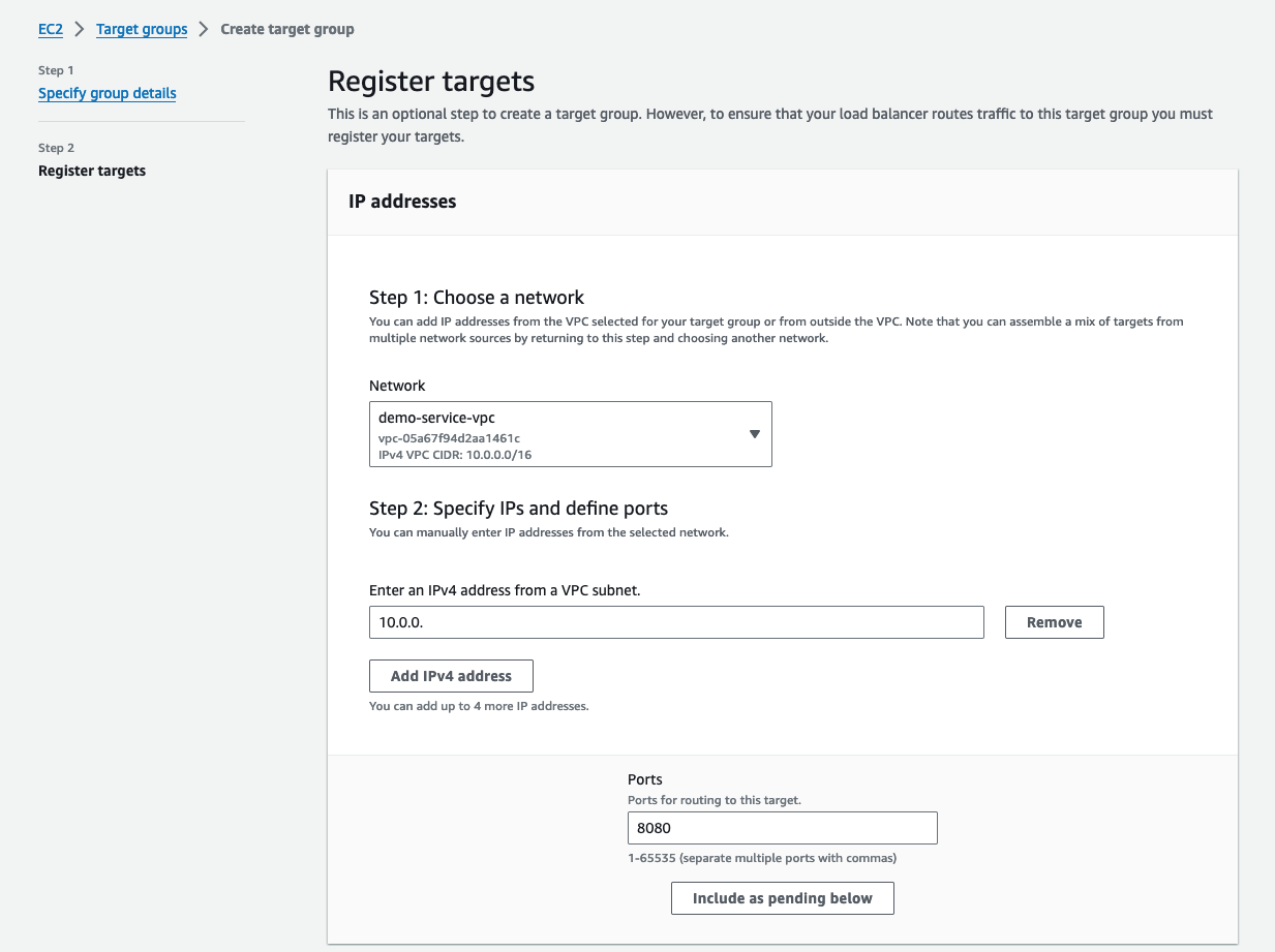 타겟 그룹으로 요청을 라우팅 할 로드 밸런서가 호스팅 될 VPC를 지정한다. 해당 VPC에 등록된 서비스만 타겟으로 지정될 수 있기 때문에 추후 ECS 서비스도 이 VPC를 사용할 예정이다.