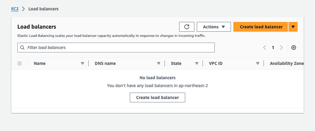 이제 본격적으로 애플리케이션 로드 밸런서를 생성해보자. 타겟 그룹은 이전 단계에서 만든 것을 사용한다. 타겟 그룹과 동일하게 로드 밸런서도 EC2 대시보드 왼쪽 하단 Load Balancing 항목에서 찾을 수 있다.