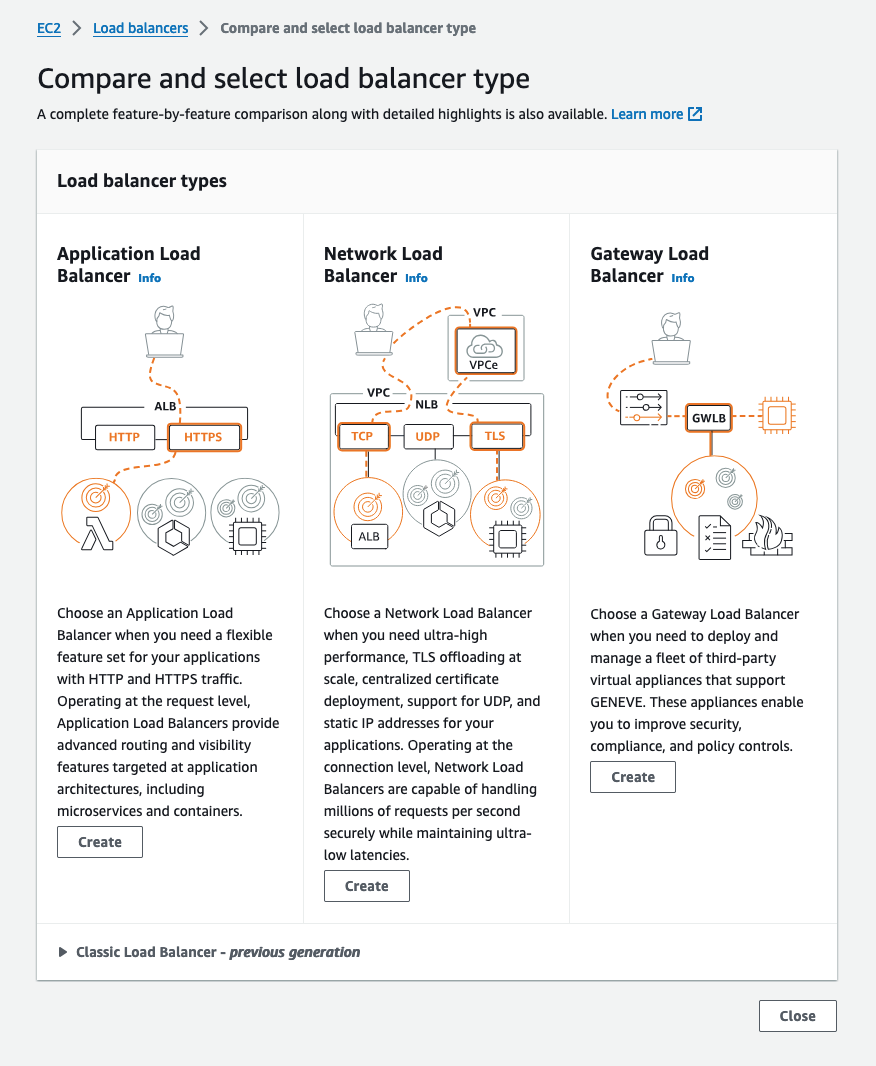 이제 애플리케이션 로드 밸런서를 생성한다. 생성하기 전에 애플리케이션 로드 밸런서는 엘라스틱 로드 밸런싱(ELB, Elastic Load Balancing) 컴포넌트의 종류 중 하나이다. 엘라스틱 로드 밸런싱 컴포넌트는 다음과 같은 로드 밸런서를 지원하고 필요에 따라 적합한 로드 밸런서를 선택한다.