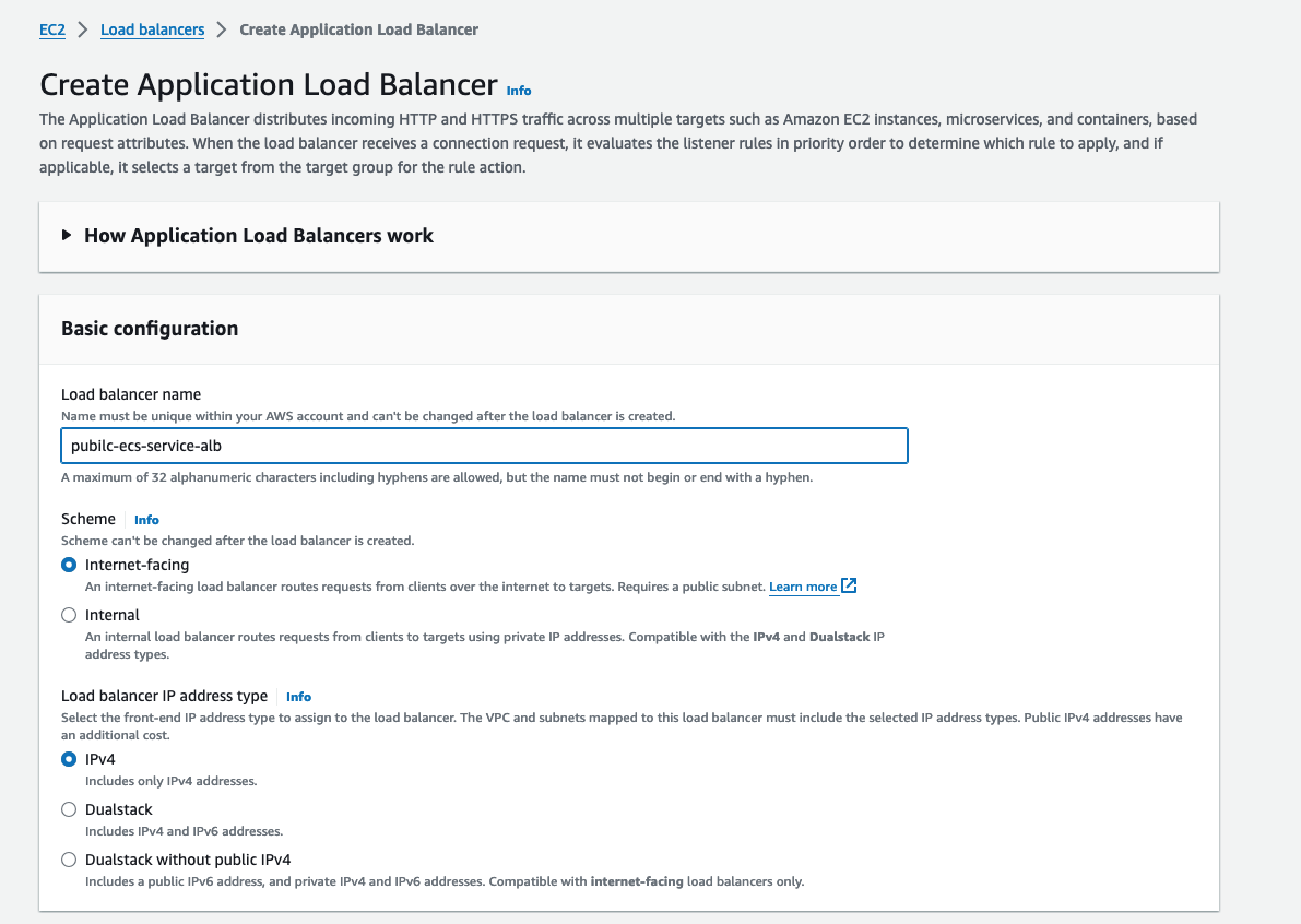 위에서도 언급했듯이 외부에서 접근하기 위해 필요한 로드 밸런서는 Application Load Balancer 타입이다. 이를 선택한다.