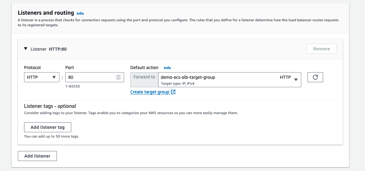 다음 리스너와 라우팅 규칙을 지정한다. 리스너는 여러 개 만들 수 있으며, 이 글은 간단한 실습이기 때문에 HTTP 방식만 사용한다.