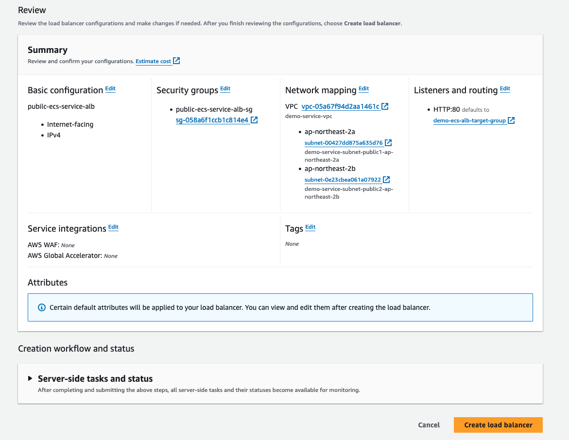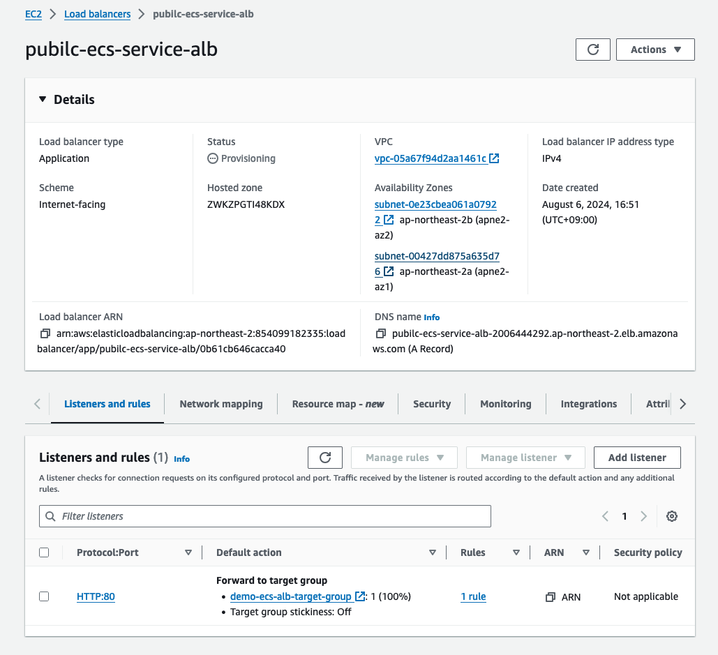 ECS 클러스터에서 사용할 로드 밸런서 준비가 끝났다. 다음과 같은 모습을 갖는다.