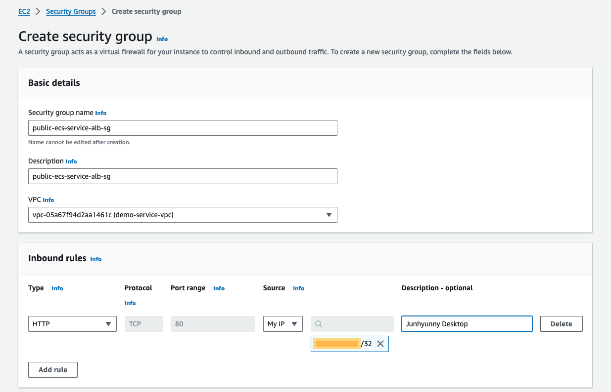 위 로드 밸런서를 위한 시큐리티 그룹을 생성한다. 시큐리티 그룹은 EC2 대시보드에서 찾을 수 있다. 이전 단계에서 생성한 로드 밸런서로 접근하기 위해선 80 포트 대한 접근이 허용되도록 인바운드(inbound) 규칙이 설정되어야 한다. IP 주소 대역은 상황에 맞게 설정한다. 글 작성을 위한 실습이므로 필자의 IP에서만 접근할 수 있도록 설정했다.