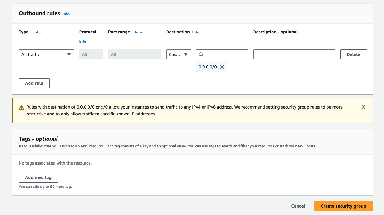 모든 트래픽을 허용하도록 아웃바운드(outbound) 규칙을 설정한다.