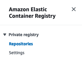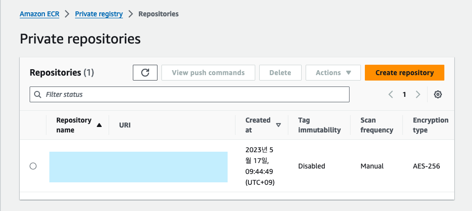 이제 프라이빗 레포지토리를 만들어보자. ECR 대시보드에서 프라이빗 레지스트리의 레포지토리 화면으로 이동한다.