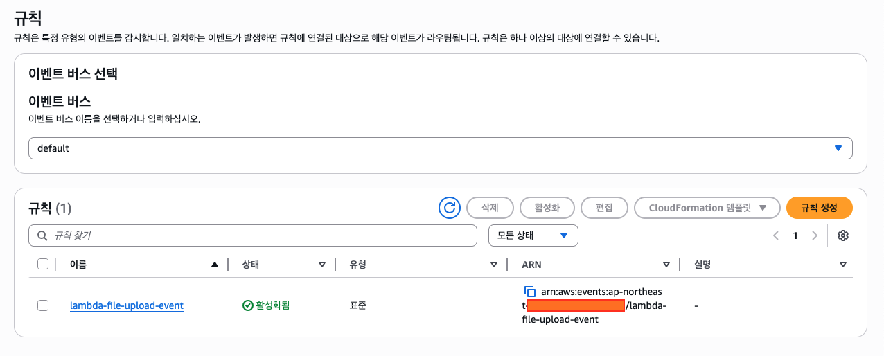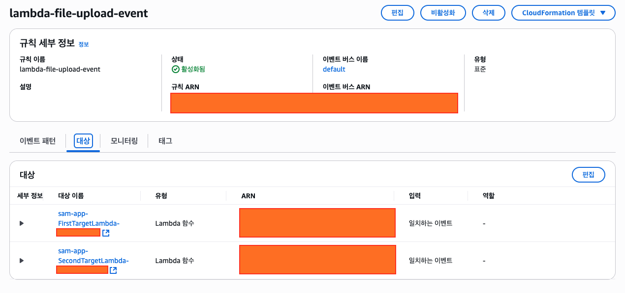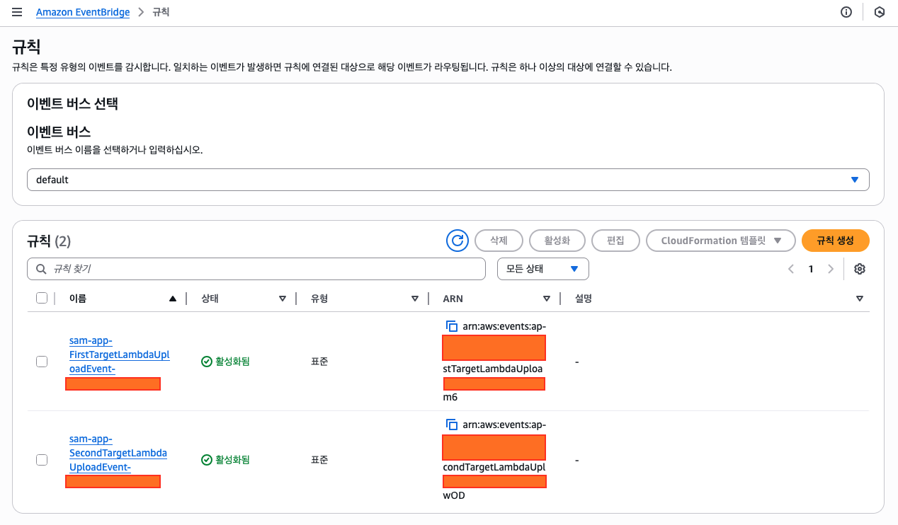 배포가 완료된 후 이벤트 브릿지를 보면 두 개의 규칙이 생성된 것을 확인할 수 있다.