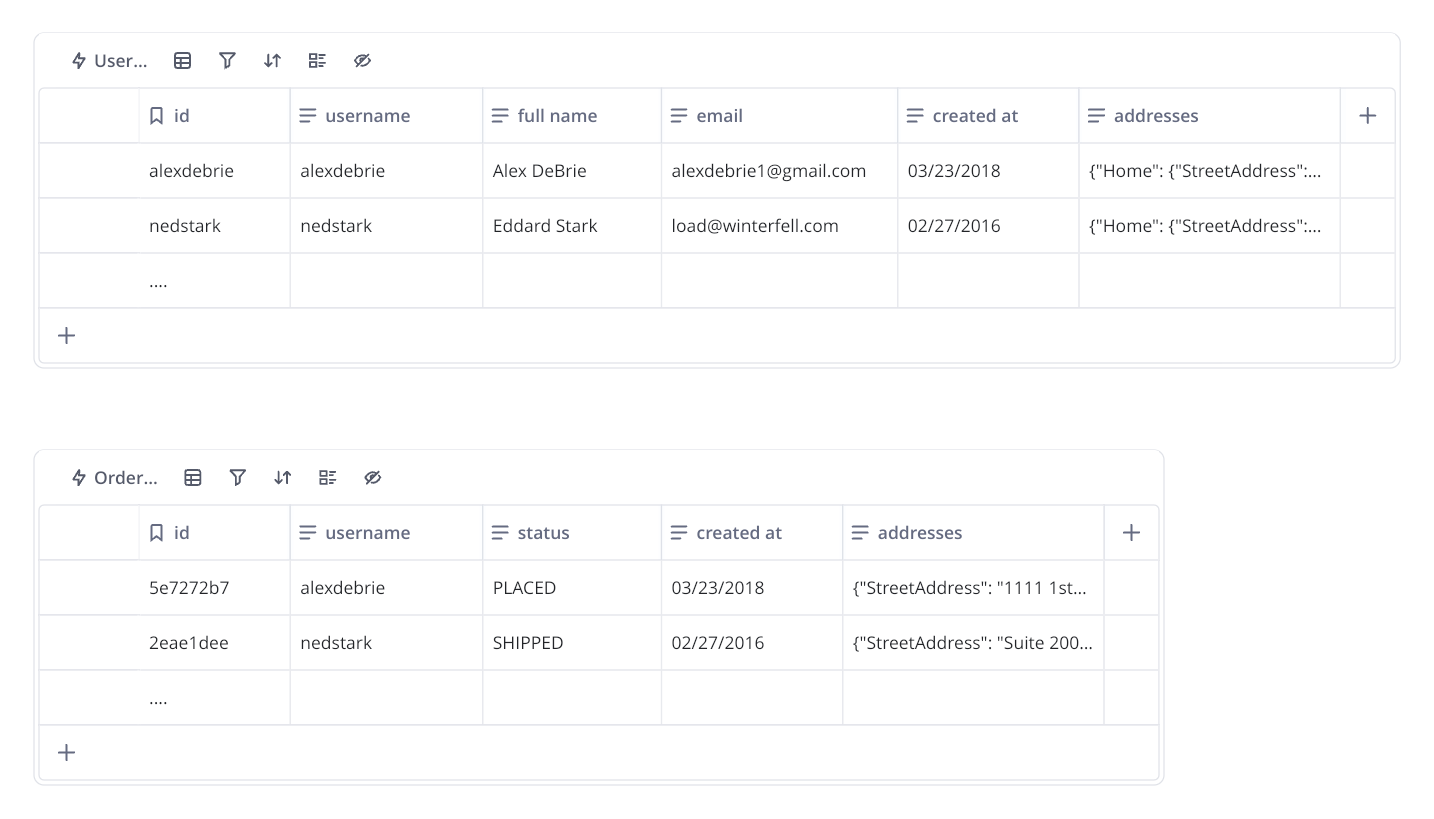 간단한 예를 들어보자. 다음과 같이 User, Order 두 개의 테이블이 DynamoDB에 구성되어 있다고 가정한다.