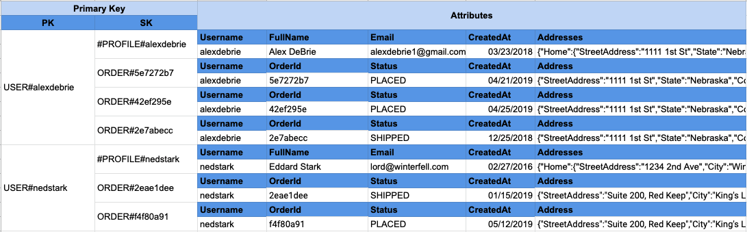 Alex DeBrie의 글을 보면 이런 문제를 해결하기 위해 사전에 조인된 형태의 데이터 컬렉션을 하나의 테이블에 저장한다. 다만, 데이터 컬렉션을 저장할 때 조인이 필요한 데이터 그룹은 동일한 파티션 키(partition key)를 사용하도록 설계한다. 이렇게 설계하면 SQL 조인을 한 것처럼 한번의 조회만으로 필요한 데이터를 모두 조회할 수 있다.