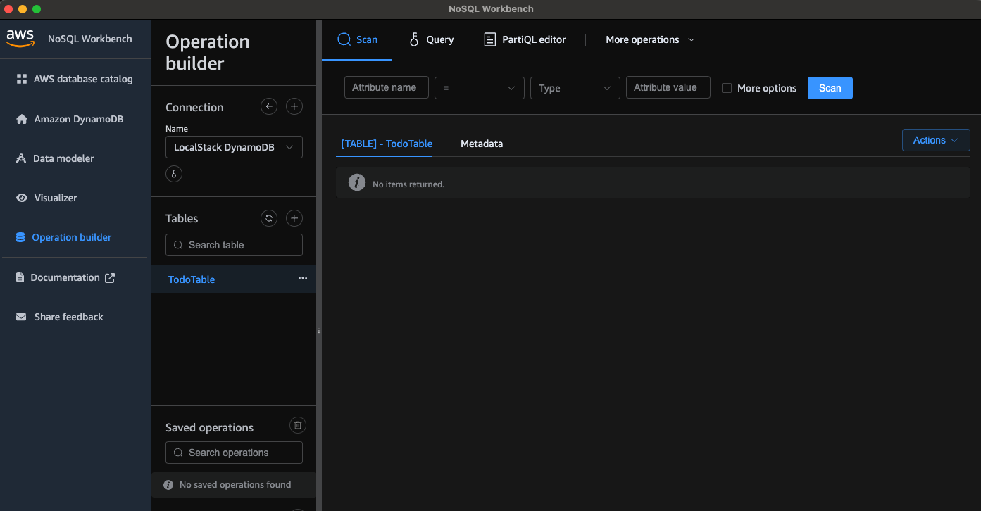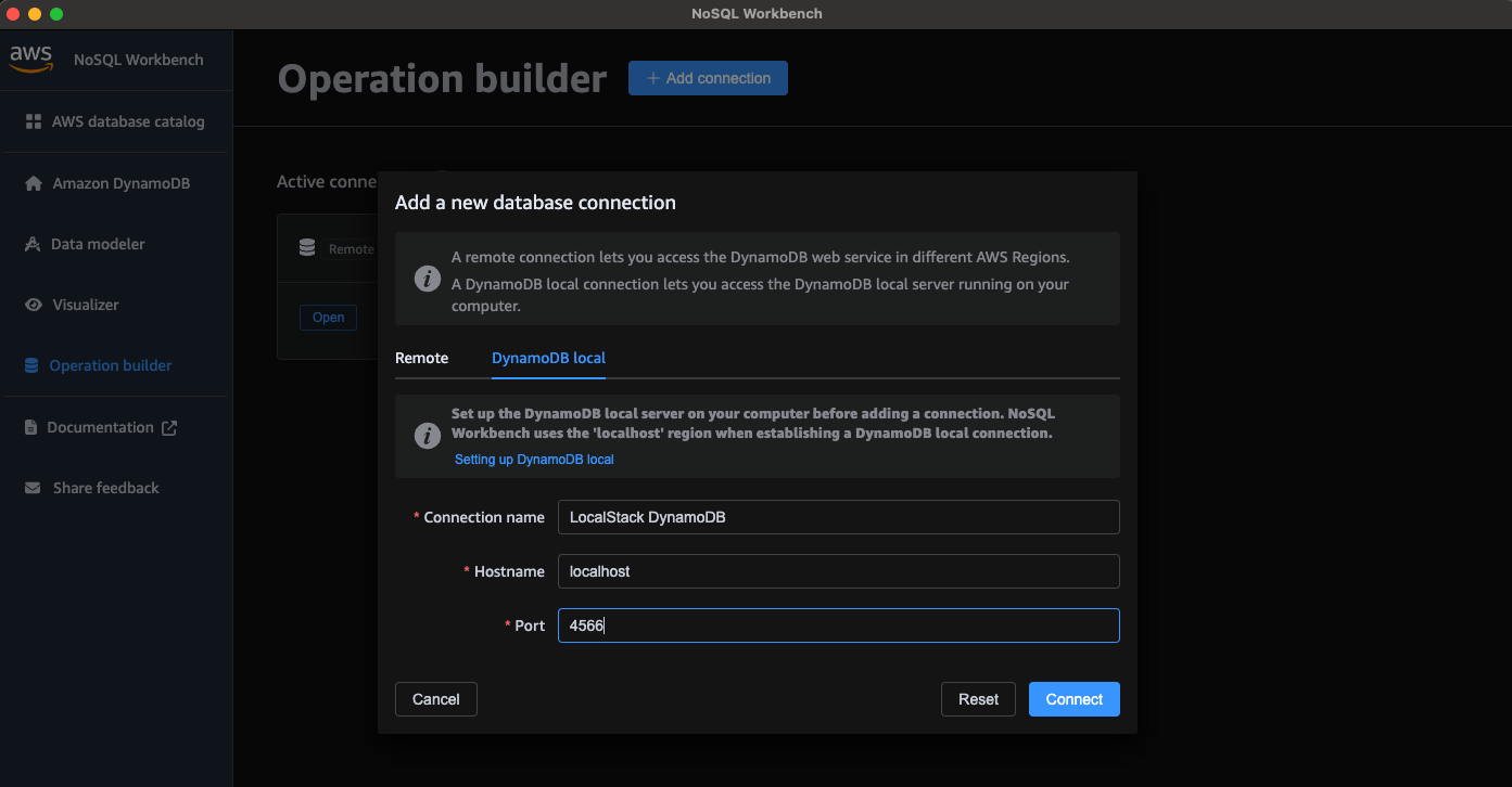 이제 NoSQL워크벤치에서 LocalStack 컨테이너로 연결하면 해당 테이블 정보를 확인할 수 있다. NoSQL워크벤치에서 4566 포트번호를 사용해 연결을 만든다.