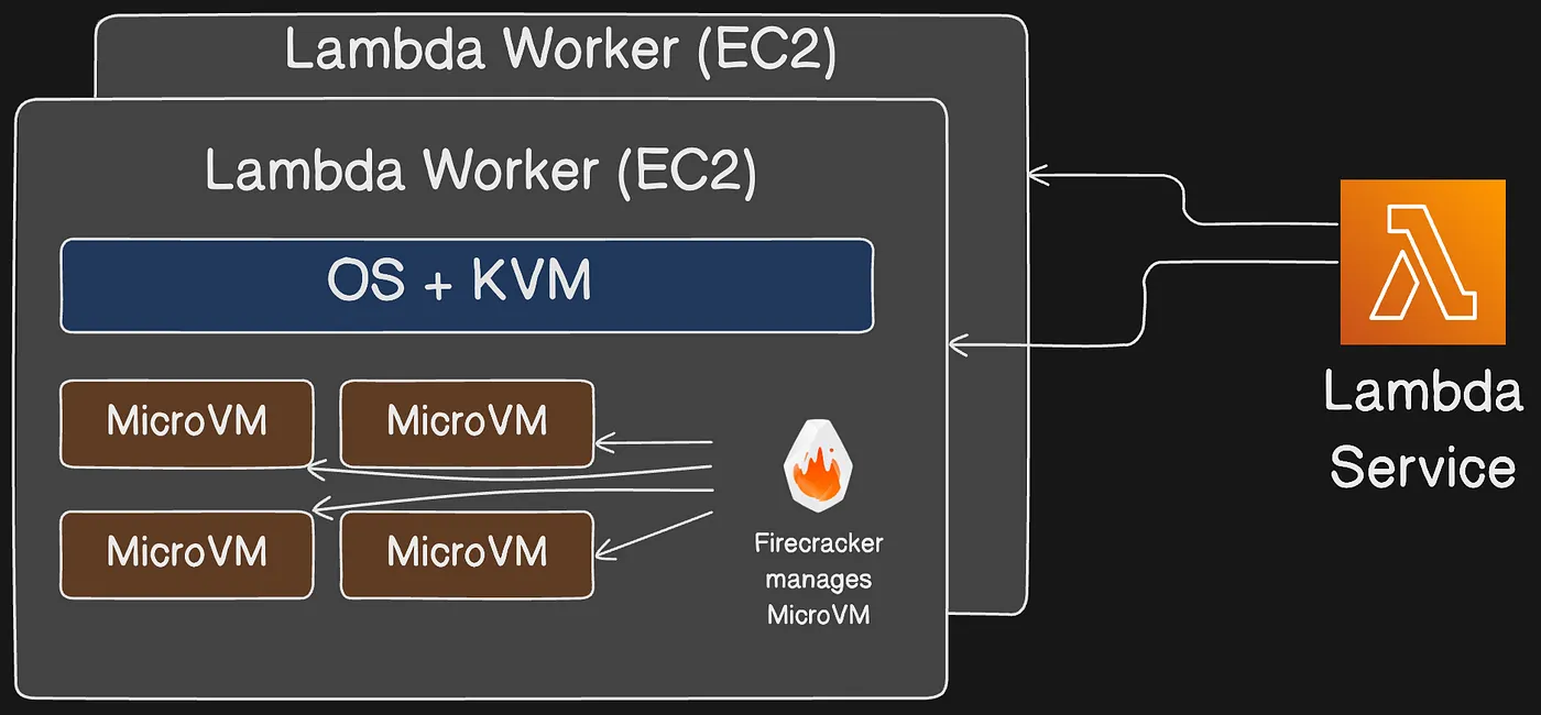 람다 워커에서 MicroVM을 실행시키는 것은 Firecracker라는 아마존이 Rust 언어로 직접 개발한 오픈 소스 가상화 기술이다. Firecracker는 가상 머신 모니터(VMM)로, 모든 Lambda 함수를 구동하는 핵심 엔진이다. KVM(커널 기반 가상 머신)을 활용해 하드웨어 가상화를 지원하며 수 밀리초 만에 부팅된다. 다중 테넌트 환경에서의 철저한 보안과 격리를 위해, 각 MicroVM은 오직 단일 함수 호출에만 독점적으로 할당된다.