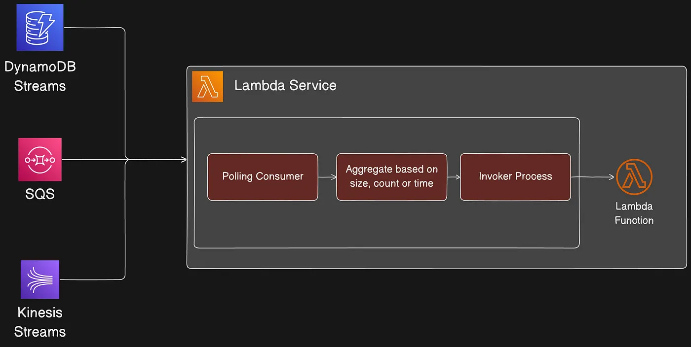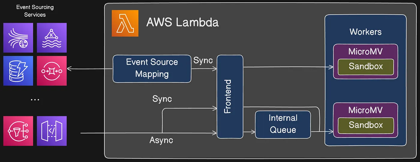추가적으로 Kinesis, DynamoDB Streams와 같은 이벤트 소스 매핑(Event Source Mapping) 환경에서는 이 프런트엔드 서비스를 호출하기 위한 별도의 내부 구성 요소가 존재한다. 내부의 폴링 컨슈머(Polling Consumer)가 레코드를 지속적으로 읽어오고, 어그리게이터(Aggregator)가 크기나 시간 등의 기준에 맞춰 데이터를 배치 형태로 묶는다. 조건이 충족되면 인보커 프로세스(Invoker Process)가 프런트엔드 서비스에 동기식 호출을 시작하여, 최종적으로 MicroVM 내부에서 함수 코드가 실행되도록 유도한다.