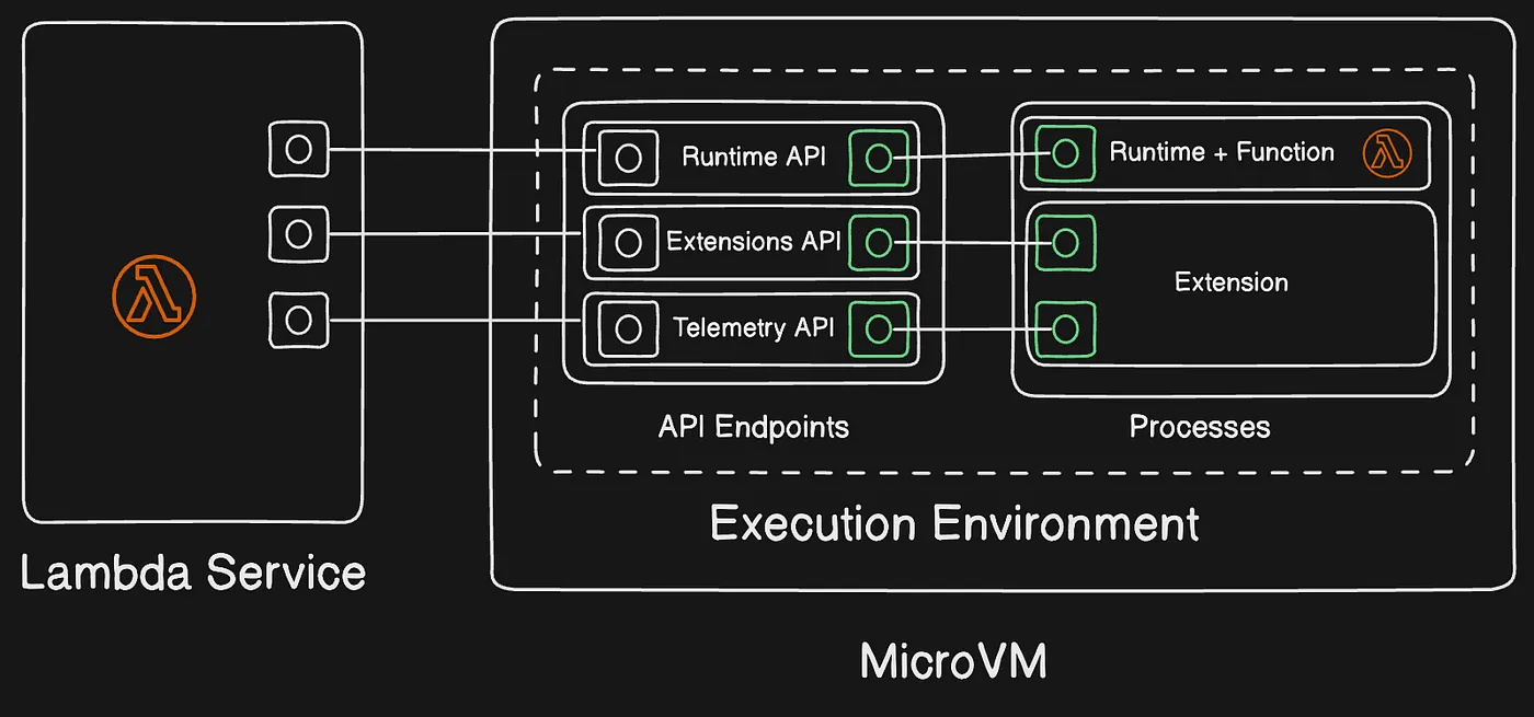 - 이 환경 내에서 함수의 런타임과 등록된 확장(Extensions)들은 개별 프로세스로 실행되지만, 권한, 자격 증명, 환경 변수 및 리소스를 서로 공유한다. 512MB에서 10GB 사이의 용량을 가진 /tmp 임시 디스크 공간도 제공된다.