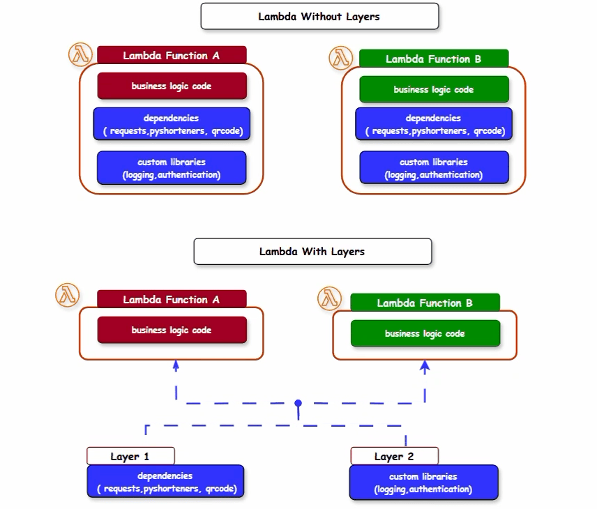 - 동일한 라이브러리나 공통 코드를 여러 람다 함수에서 공유하여 사용할 수 있으므로 코드의 중복을 막고 관리 효율성을 높일 수 있다.