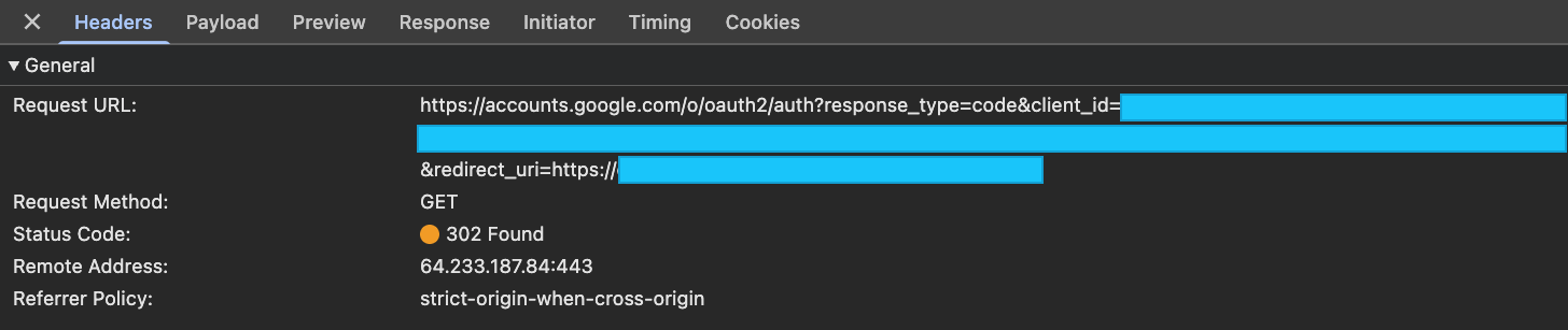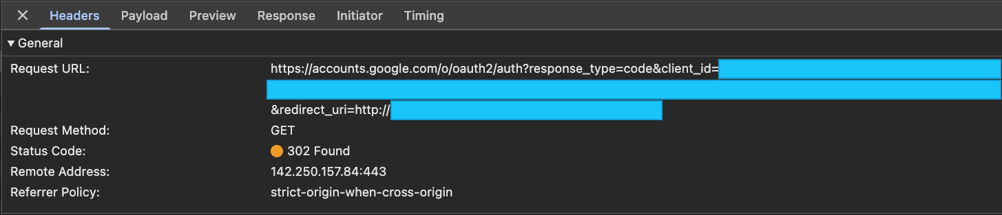 브라우저의 개발자 모드를 통해 네트워크 탭으로 OAuth2 인가 코드 리다이렉트 요청을 살펴보면 리다이렉트 URL의 프로토콜이 https가 아닌 http인 것을 확인할 수 있다.
