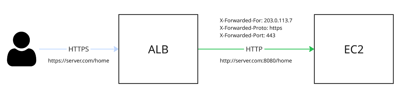 AWS ALB는 서버 애플리케이션 기준으로 프록시 서버 역할을 수행한다. 비표준이긴 하지만, 원본 요청에 대한 정보를 전달하기 위해 X-Forwarded- 헤더를 사용한다. AWS ALB 공식 문서를 보면 다음과 같은 3개의 헤더를 제공한다.