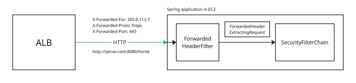 X-Forwarded-헤더 값을 사용할 수 있도록 HttpServletRequest 객체를 ForwardedHeaderExtractingRequest 객체로 랩핑(wrapping)하여 다음 체인으로 전달한다.- ForwardedHeaderFilter의 다음 필터부터는 요청 객체의 헤더, 프로토콜을 원본 요청의 것을 사용한다.