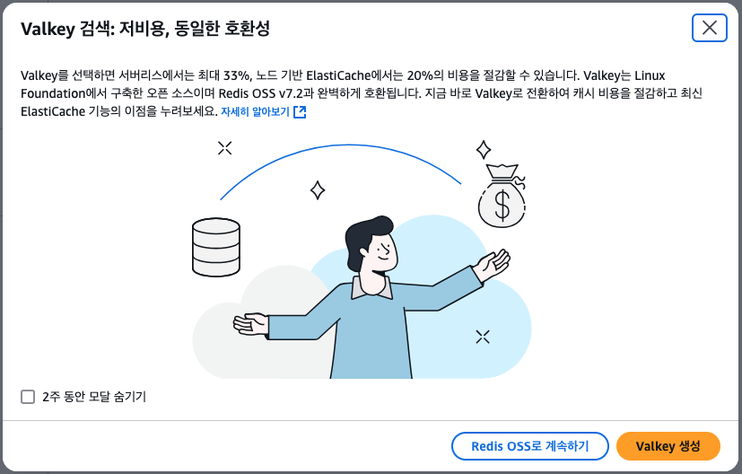 가격도 33% 저렴하고 레디스와 완벽하게 호환된다고 하니 선택하지 않을 이유가 없다고 생각했다. 이번 글은 밸키(Valkey) 서버리스(serverless)를 구축하면서 만났던 에러들에 대해 정리했다.