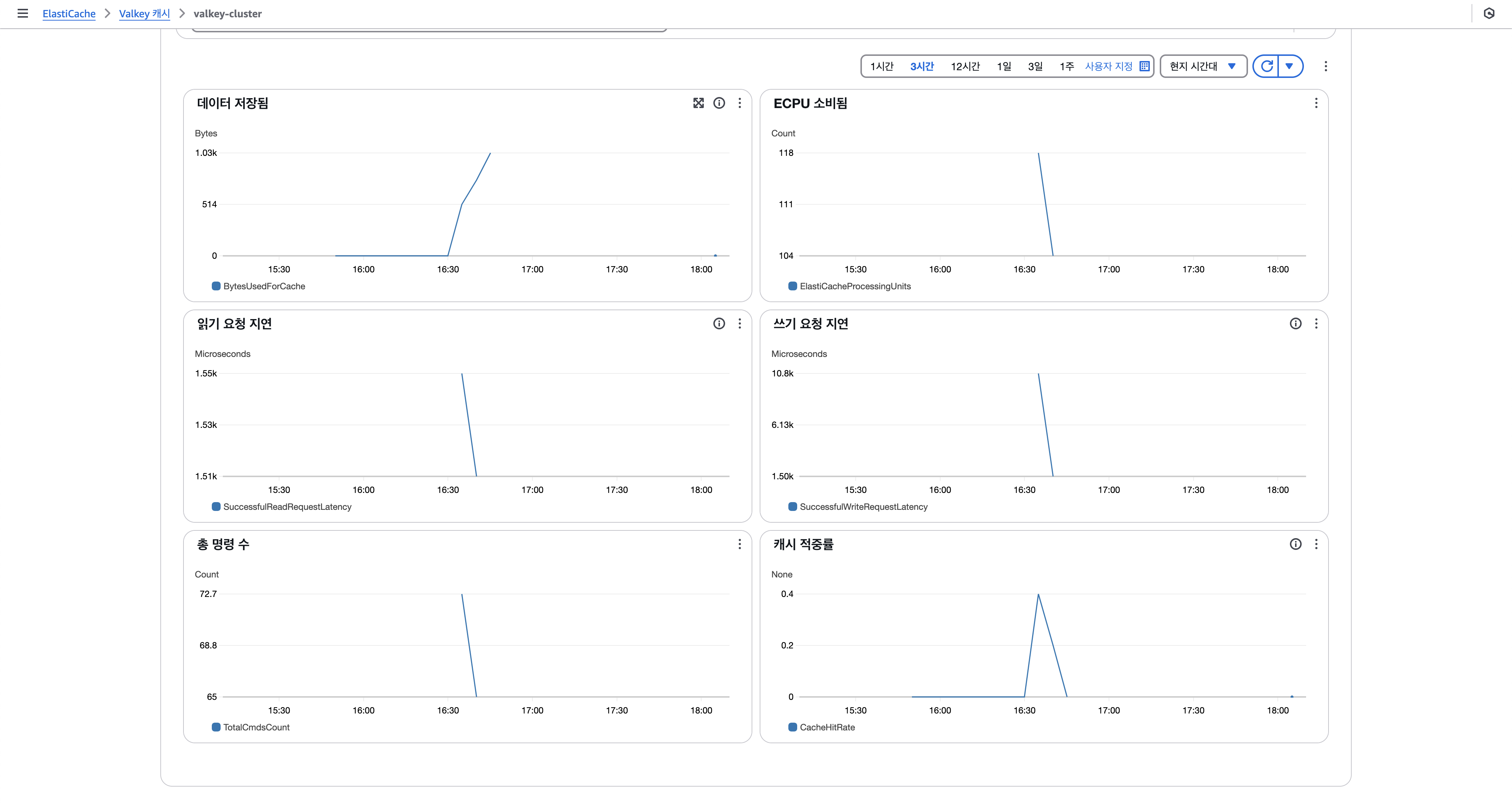 엘라스틱캐시 밸키 클러스터 모니터링 화면에서 세션 정보가 저장되었는지 캐시가 히트했는지 확인할 수 있다.