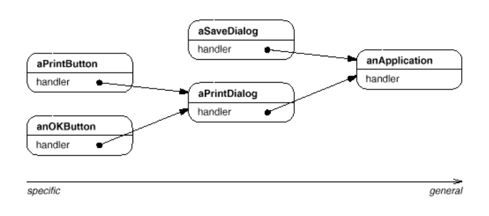 문제는 도움말 정보를 제공하는 컴포넌트는 사용자가 도움말을 요청하기 위해 클릭한 인터페이스 컴포넌트의 존재를 모른다는 점이다. 이 문제를 해결하기 위해 여러 개체들이 특정 요청을 처리하기 위한 연결 고리를 만들고 요청을 재전달한다.
