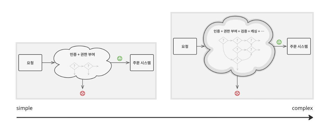 인증, 인가, 유효성 검사, 무차별 공격 방어, 캐싱 등 너무 많은 기능들이 모여있다. 새로운 기능을 추가할 때마다 코드의 복잡성은 증가하고 이는 코드를 수정, 검증하는 데 더 많은 비용을 들게 만드는 악순환의 고리를 만든다. 비슷한 검증이 필요한 다른 시스템에선 코드 일부분을 복제해가기 때문에 비슷한 코드가 점점 늘어난다.