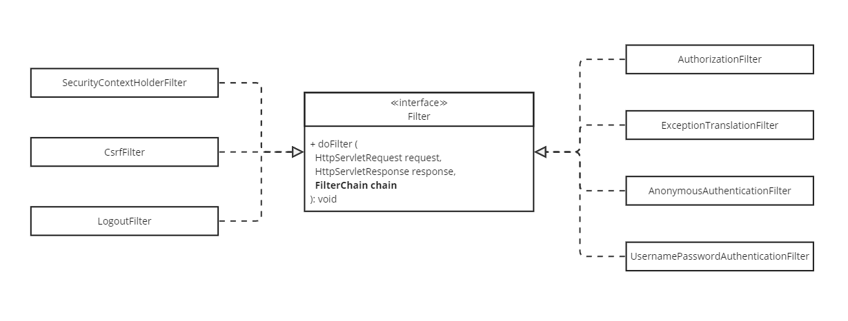 스프링 시큐리티 필터 체인에 적용된 책임 연쇄 패턴을 클래스 다이어그램으로 다시 살펴보자. 다이어그램에 정리된 필터 외에 더 많은 필터들이 인증, 인가에 참여한다.