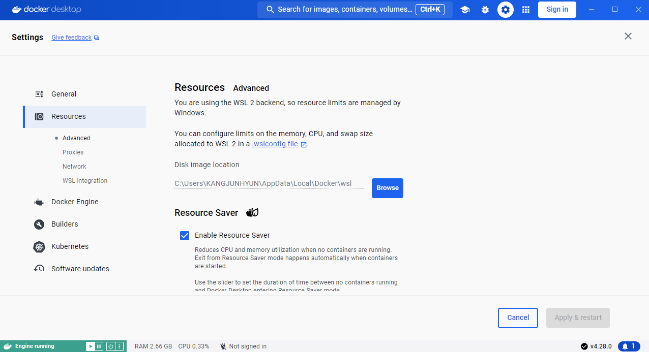 도커 데스크탑 리소스 설정 화면에서 알려주듯 윈도우 운영체제에서 컨테이너 런타임 리소스를 제한하라면 .wslconfig 파일을 통해 WSL 리소스를 직접 제한해야한다. .wslconfig은 해당 운영체제에 설치된 모든 WSL 시스템들에 대해 전역 설정을 할 수 있는 파일이다. C:\Users\<UserName> 경로에 .wslconfig 파일을 만든다.