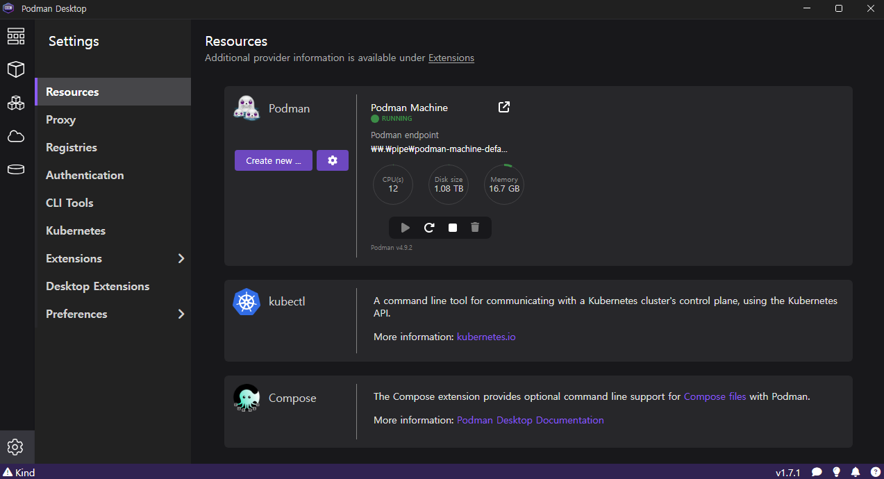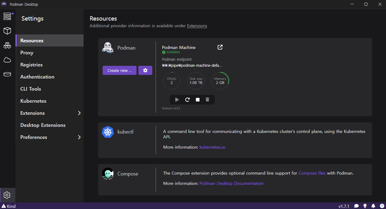 도커 데스크탑이나 파드맨 데스크탑 같은 GUI 도구를 통해 리소스를 제한을 시도했다. 라이센스 문제로 중간에 컨테이너 런타임을 변경했기 때문에 두가지 도구를 모두 확인할 수 있었다. 캡처한 이미지는 필자의 개인 PC이기 때문에 리소스 정보는 실제 서버와 전혀 무관하다.