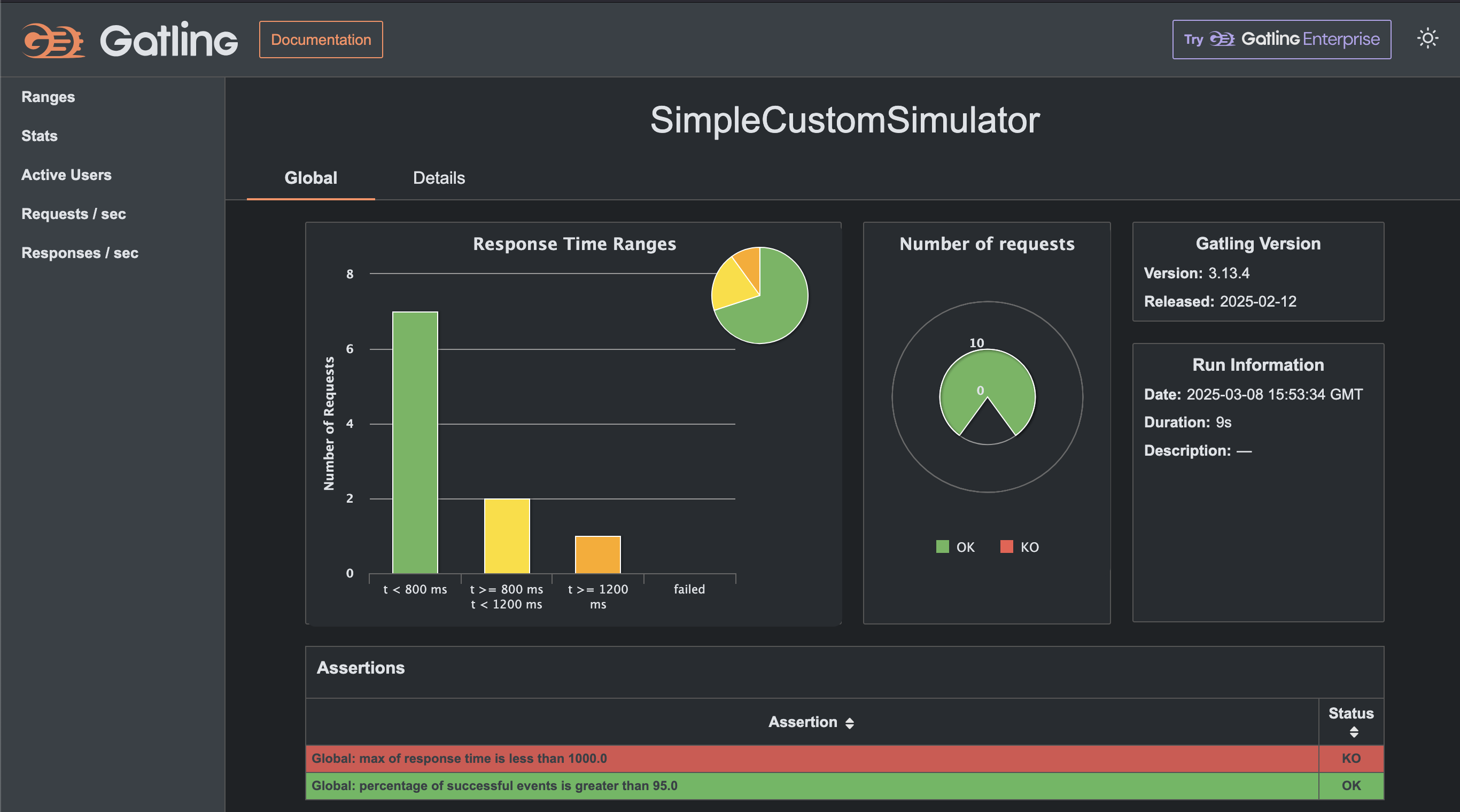 어설션(assertion)은 응답 시간이나 실패한 요청 수와 같은 글로벌 통계가 전체 시뮬레이션에 대한 예상과 일치하는지 확인하는데 사용한다. 예를 들면 다음과 같이 어설션을 등록한다.