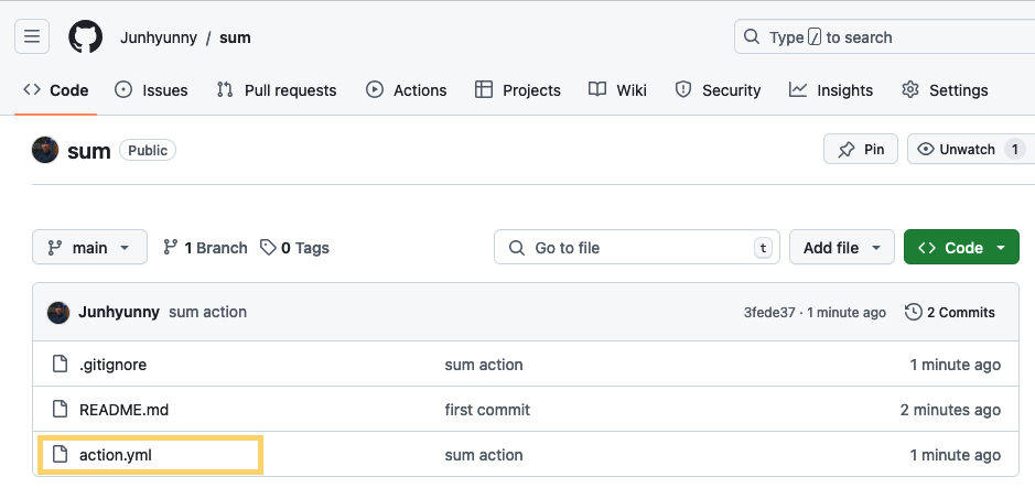 먼저 별도 레포지토리에 커스텀 액션을 만들어보자. 예제를 위해 sum이라는 새로운 레포지토리를 만든다. 해당 레포지토리 루트에 action.yml 파일을 만든다.