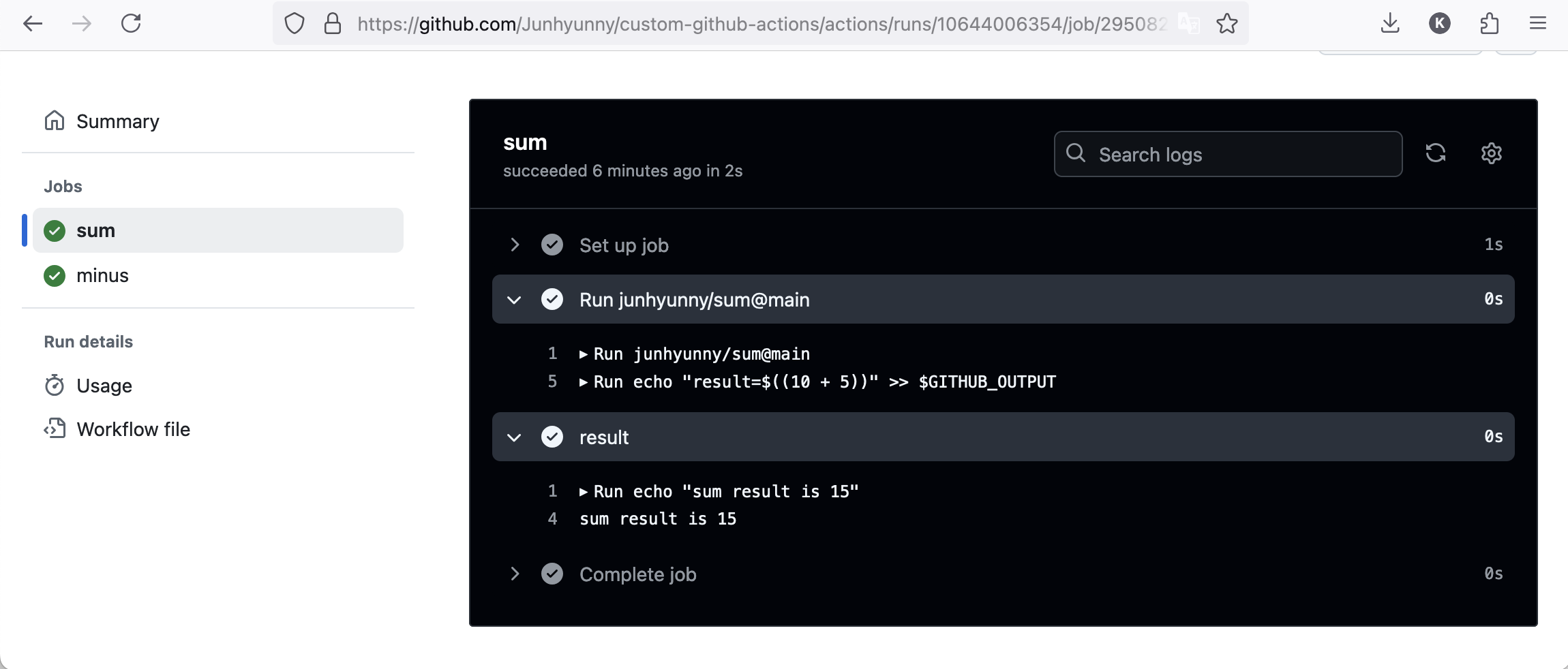 steps.{custom-action-step-id}.outputs.sum-result을 통해 이 값에 접근할 수 있다. - sum-result 변수에 저장되는 값은steps.{step-id}.outputs.{key}이다.