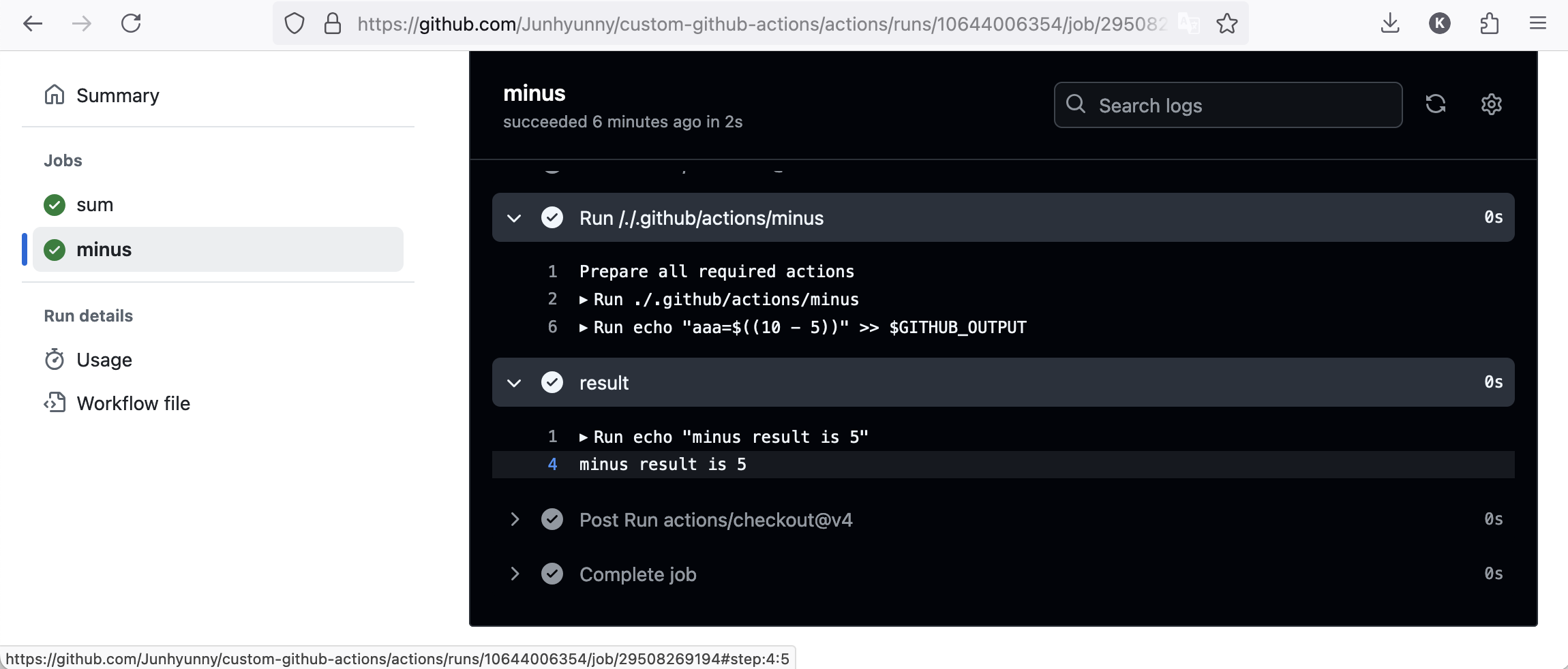 steps.{custom-action-step-id}.outputs.minus-result을 통해 이 값에 접근할 수 있다. - minus-result 변수에 저장되는 값은steps.{step-id}.outputs.{key}이다.