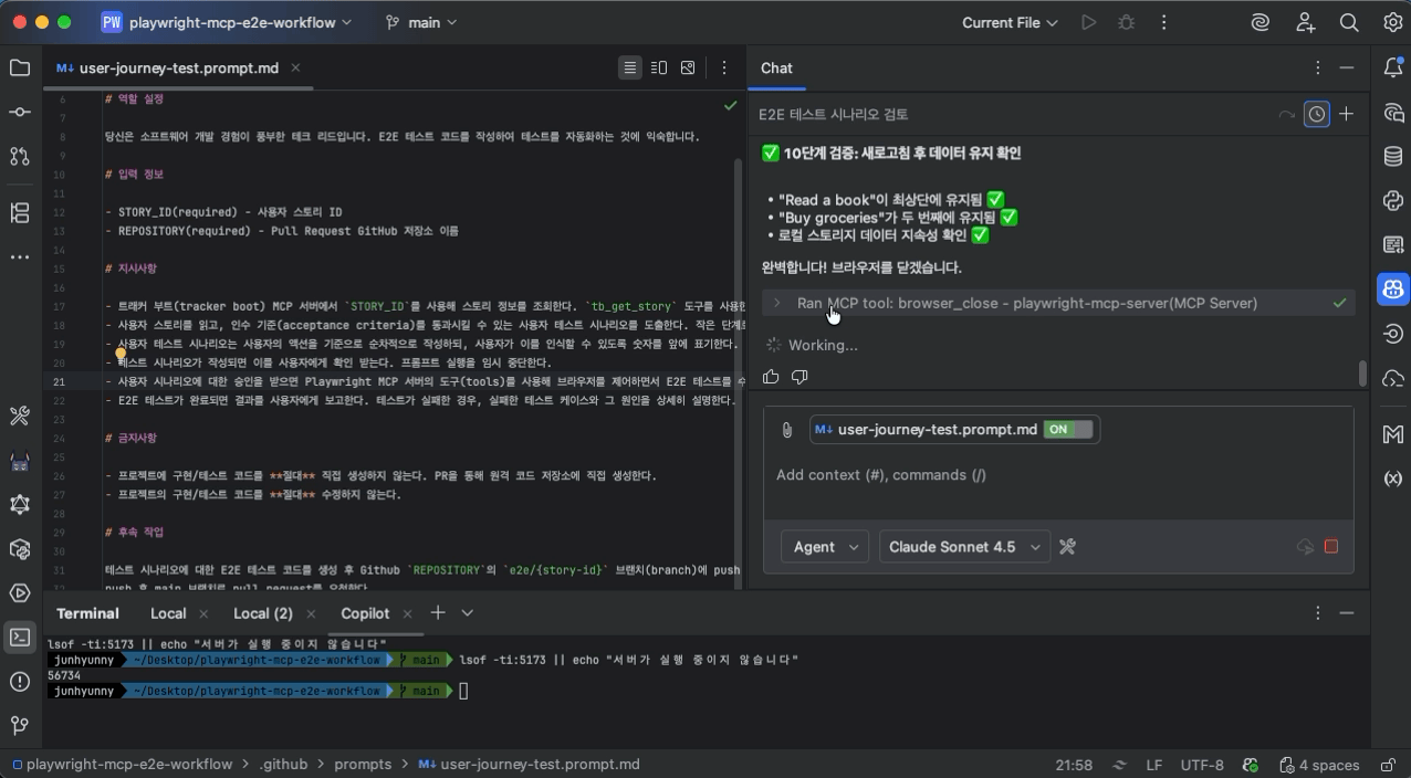 - 사용자 시나리오에 대한 승인을 받으면 Playwright MCP 서버의 도구(tools)를 사용해 브라우저를 제어하면서 E2E 테스트를 수행한다.