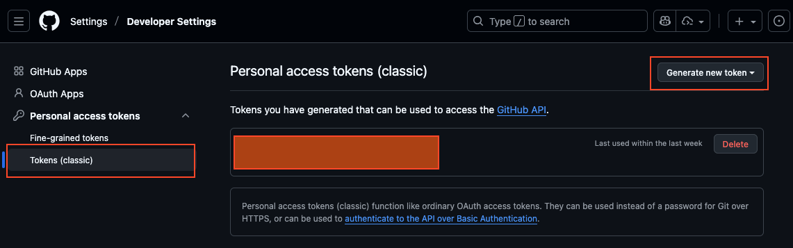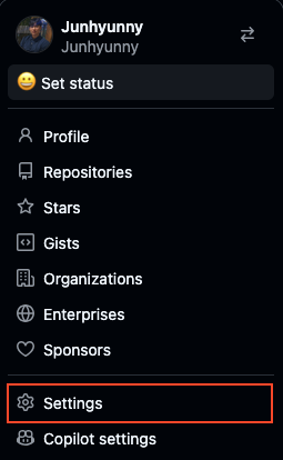 트래커 부트 MCP 서버를 위해 필요한 API 키는 트래커 부트(tracker boot) MCP 서버로 프롬프트 컨텍스트 공유하기 글을 참조하길 바란다. Github 토큰은 사용자 셋팅(setting) 페이지에서 생성할 수 있다. 프로파일 이미지를 클릭하면 셋팅 페이지로 이동하는 버튼을 볼 수 있다.