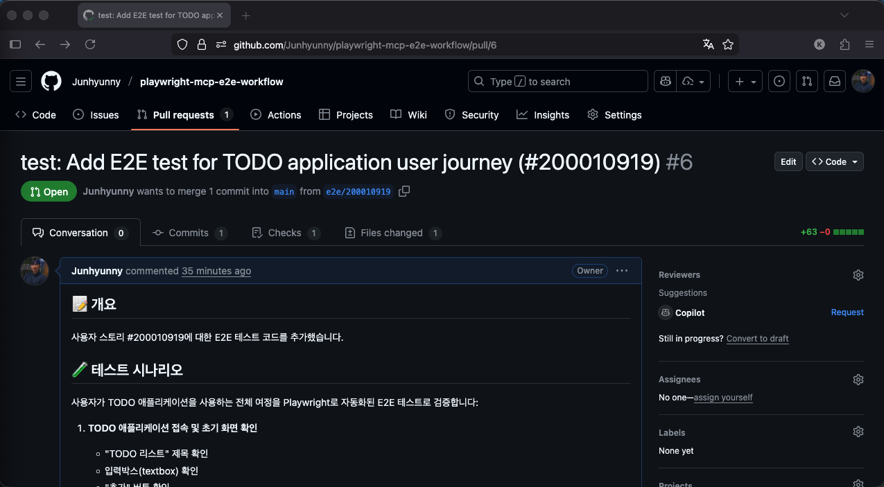 프롬프트 실행이 완료된 후 AI 에이전트가 명시한 링크로 이동하면 풀 리퀘스트가 만들어진 것을 볼 수 있다.