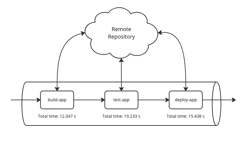 파이프라인 스크립트를 변경 후 애플리케이션 코드를 푸시하면 다음과 같이 파이프라인이 동작합니다. 각 잡 별로 캐시 경로를 공유할 뿐만 아니라 매 파이프라인마다 다운로드 받던 의존성을 다시 받지 않는다는 점입니다. 캐시가 파이프라인마다 공유됩니다.