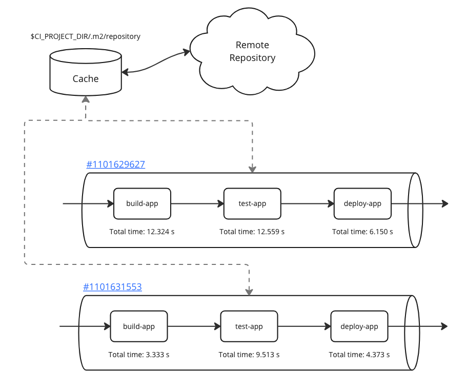 $CI_PROJECT_DIR/.m2/repository경로를 캐싱합니다.MAVEN_OPTS옵션을 통해 로컬 레포지토리 경로를$CI_PROJECT_DIR/.m2/repository로 설정합니다.MAVEN_OPTS환경 변수는 메이븐 빌드시 사용되므로 선언만으로도 적용됩니다.