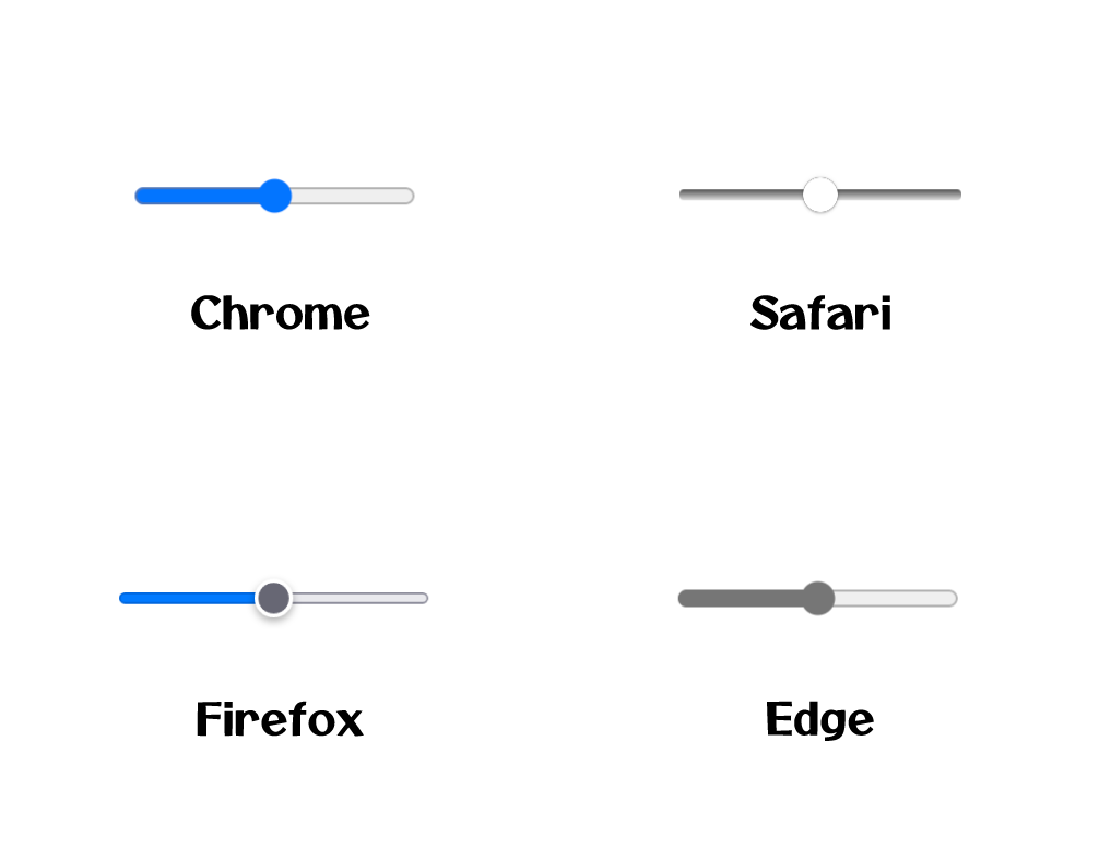 range 타입 input HTML 엘리먼트는 크로스 브라우저(cross browser) 문제가 있다. 브라우저마다 자동으로 색이나 모양을 지정하기 때문에 외형이 다르다.