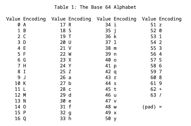 RFC 표준에서 Base64 인코딩에 사용되는 문자들을 다음과 같이 정의한다.