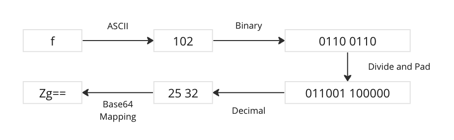 011001 100000을 십진수로 표현하면25 32이다.25 32를 Base64 테이블의 문자로 매핑하면Zg==이다.- 패딩 비트가 추가된 횟수만큼 = 문자를 추가한다.